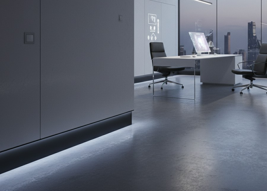 • -Кабинет в стиле хай-тек: Скрытый металлический плинтус с подсветкой создает футуристичную световую линию, подчеркивая технологичность пространства.